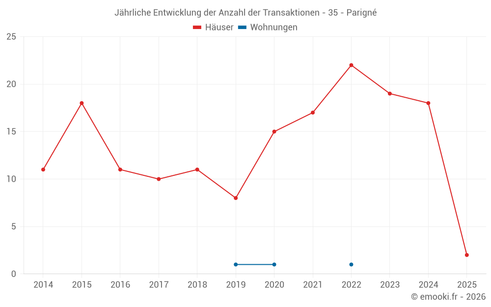 Der Durchschnittspreis auf den 29 Hausgeschäften der letzten 24 Monate in der Gemeinde Parigné betrug 1 670 € pro Quadratmeter für einen mittleren Immobilienwert von 187 890 €. Über diesen Zeitraum hinweg lagen 60% der Transaktionen zwischen 1 293 und 2 369 € pro Quadratmeter (vom 2. bis zum 8. Dezil).