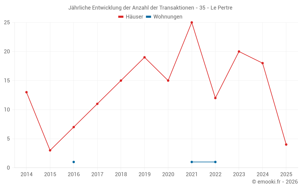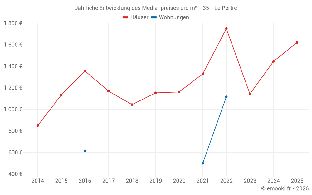 Der Durchschnittspreis auf den 29 Hausgeschäften der letzten 24 Monate in der Gemeinde Le Pertre betrug 1 463 € pro Quadratmeter für einen mittleren Immobilienwert von 142 500 €. Über diesen Zeitraum hinweg lagen 60% der Transaktionen zwischen 899 und 1 989 € pro Quadratmeter (vom 2. bis zum 8. Dezil).