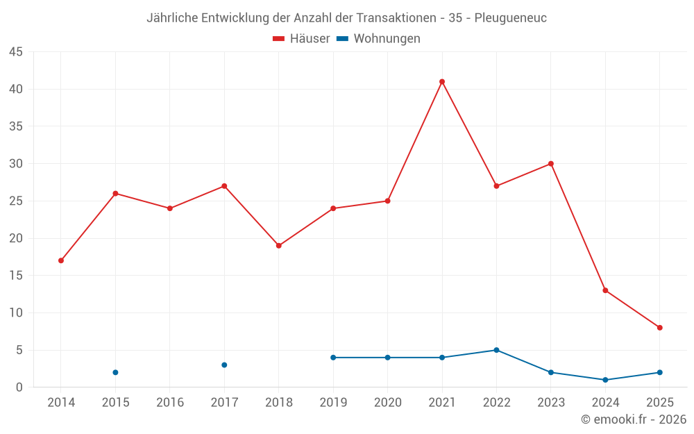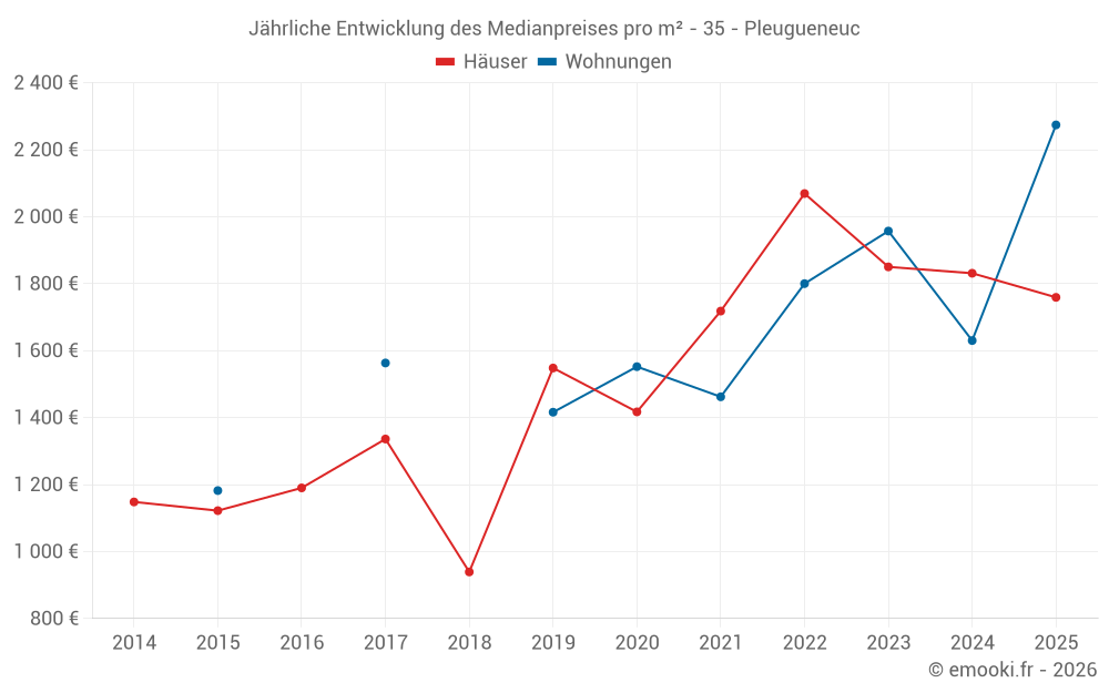 Der Durchschnittspreis auf den 17 Hausgeschäften der letzten 12 Monate in der Gemeinde Pleugueneuc betrug 1 869 € pro Quadratmeter für einen mittleren Immobilienwert von 194 870 €. Über diesen Zeitraum hinweg lagen 60% der Transaktionen zwischen 1 512 und 2 339 € pro Quadratmeter (vom 2. bis zum 8. Dezil).