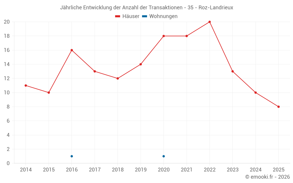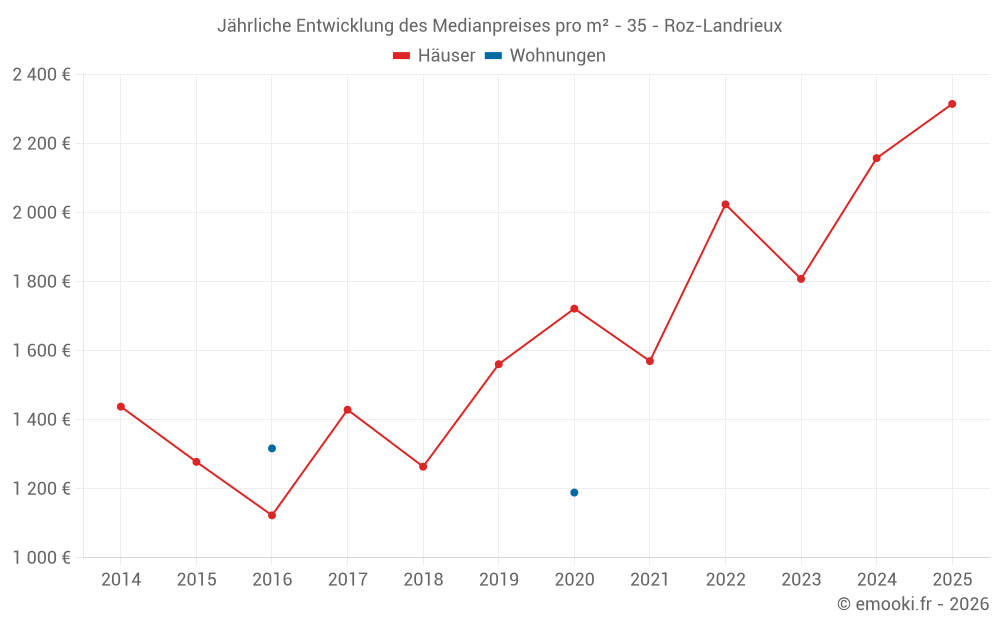 Der Durchschnittspreis auf den 25 Hausgeschäften der letzten 24 Monate in der Gemeinde Roz-Landrieux betrug 2 083 € pro Quadratmeter für einen mittleren Immobilienwert von 195 000 €. Über diesen Zeitraum hinweg lagen 60% der Transaktionen zwischen 1 665 und 2 494 € pro Quadratmeter (vom 2. bis zum 8. Dezil).