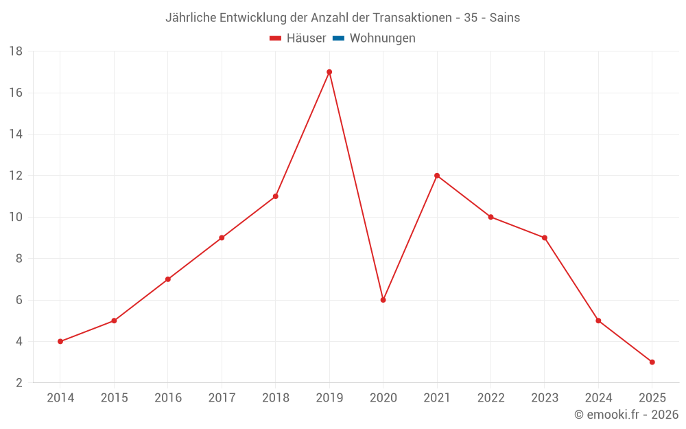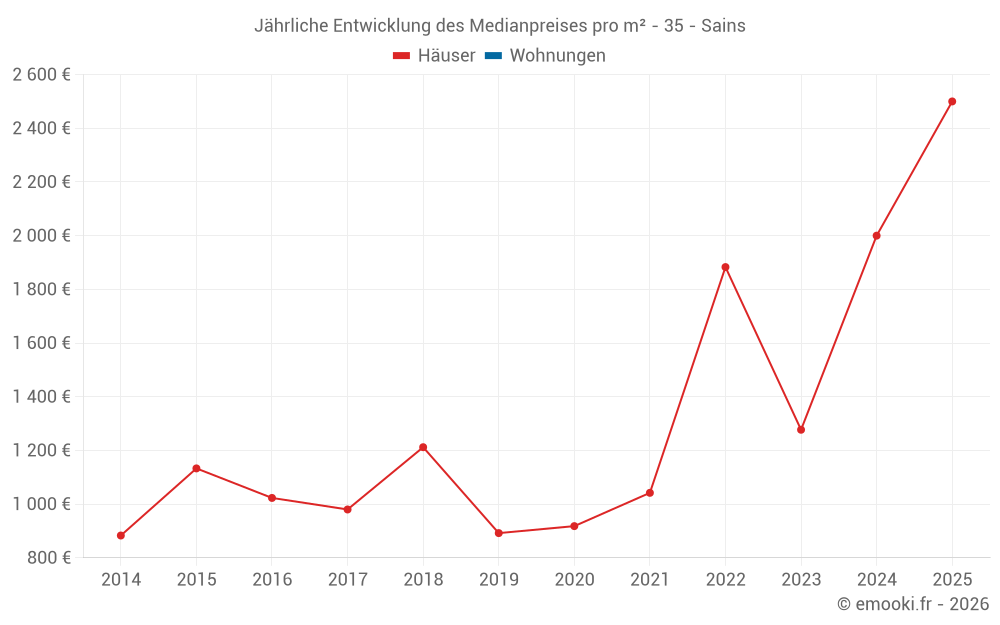 Der Durchschnittspreis auf den 15 Hausgeschäften der letzten 24 Monate in der Gemeinde Sains betrug 1 667 € pro Quadratmeter für einen mittleren Immobilienwert von 120 000 €. Über diesen Zeitraum hinweg lagen 60% der Transaktionen zwischen 1 044 und 2 184 € pro Quadratmeter (vom 2. bis zum 8. Dezil).