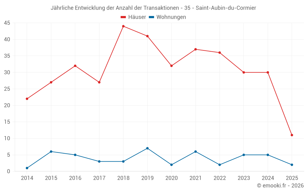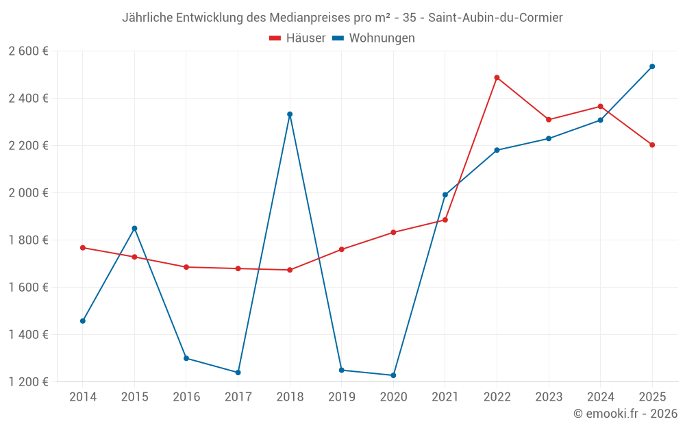Der Durchschnittspreis auf den 24 Hausgeschäften der letzten 12 Monate in der Gemeinde Saint-Aubin-du-Cormier betrug 2 292 € pro Quadratmeter für einen mittleren Immobilienwert von 261 500 €. Über diesen Zeitraum hinweg lagen 60% der Transaktionen zwischen 1 636 und 2 650 € pro Quadratmeter (vom 2. bis zum 8. Dezil).