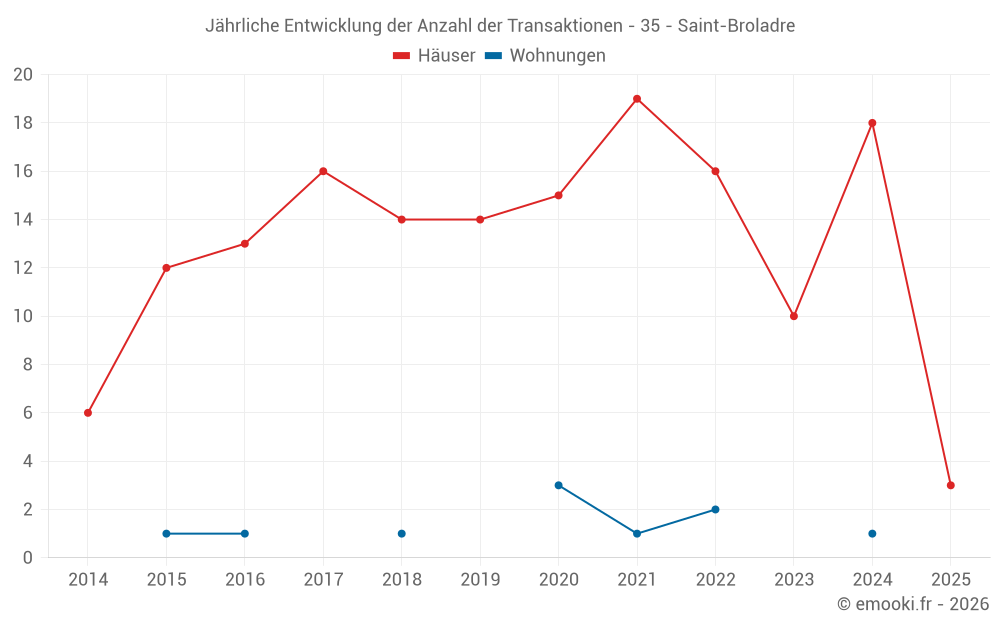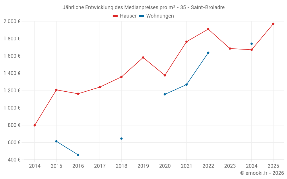 Der Durchschnittspreis auf den 27 Hausgeschäften der letzten 24 Monate in der Gemeinde Saint-Broladre betrug 1 676 € pro Quadratmeter für einen mittleren Immobilienwert von 150 000 €. Über diesen Zeitraum hinweg lagen 60% der Transaktionen zwischen 1 286 und 2 338 € pro Quadratmeter (vom 2. bis zum 8. Dezil).