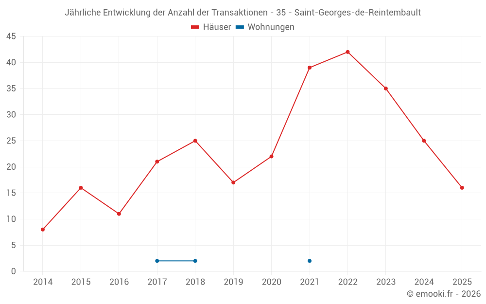Der Durchschnittspreis auf den 30 Hausgeschäften der letzten 12 Monate in der Gemeinde Saint-Georges-de-Reintembault betrug 1 205 € pro Quadratmeter für einen mittleren Immobilienwert von 127 442 €. Über diesen Zeitraum hinweg lagen 60% der Transaktionen zwischen 787 und 1 735 € pro Quadratmeter (vom 2. bis zum 8. Dezil).