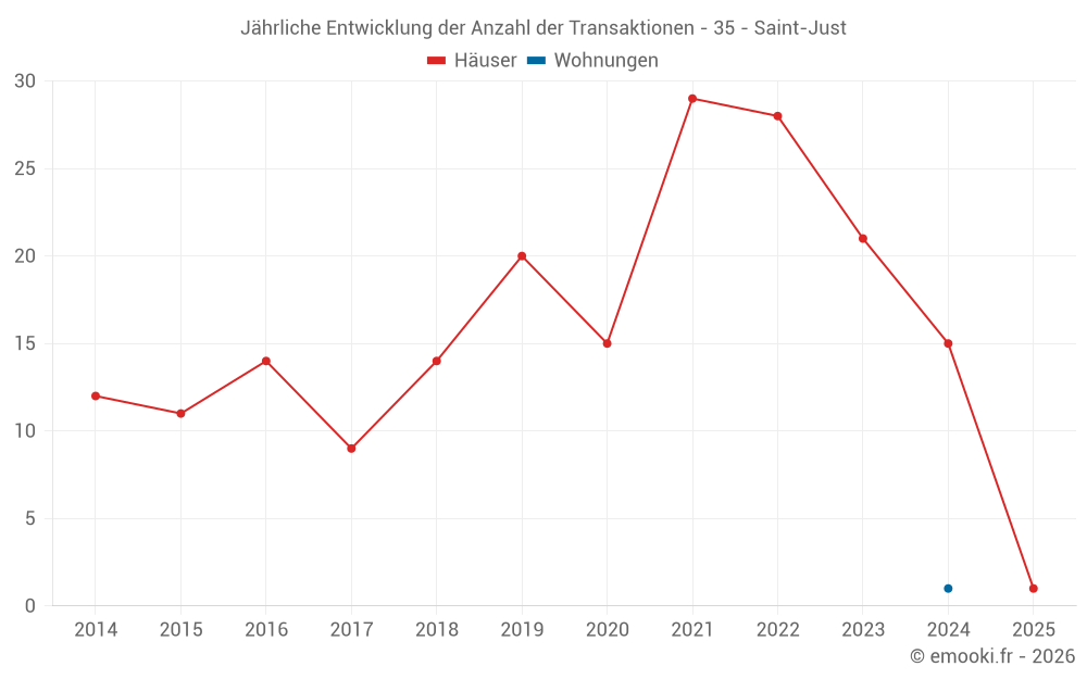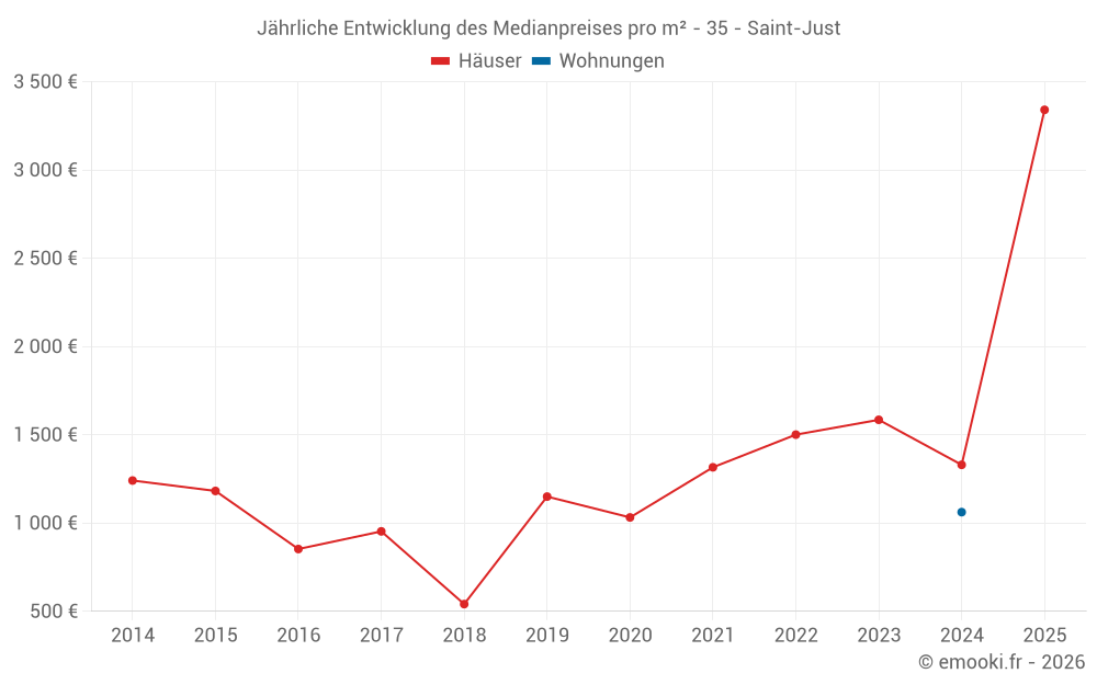 Der Durchschnittspreis auf den 28 Hausgeschäften der letzten 24 Monate in der Gemeinde Saint-Just betrug 1 554 € pro Quadratmeter für einen mittleren Immobilienwert von 161 200 €. Über diesen Zeitraum hinweg lagen 60% der Transaktionen zwischen 1 138 und 1 953 € pro Quadratmeter (vom 2. bis zum 8. Dezil).
