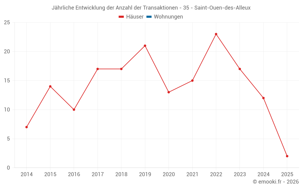 Der Durchschnittspreis auf den 24 Hausgeschäften der letzten 24 Monate in der Gemeinde Saint-Ouen-des-Alleux betrug 1 773 € pro Quadratmeter für einen mittleren Immobilienwert von 127 000 €. Über diesen Zeitraum hinweg lagen 60% der Transaktionen zwischen 1 334 und 1 987 € pro Quadratmeter (vom 2. bis zum 8. Dezil).