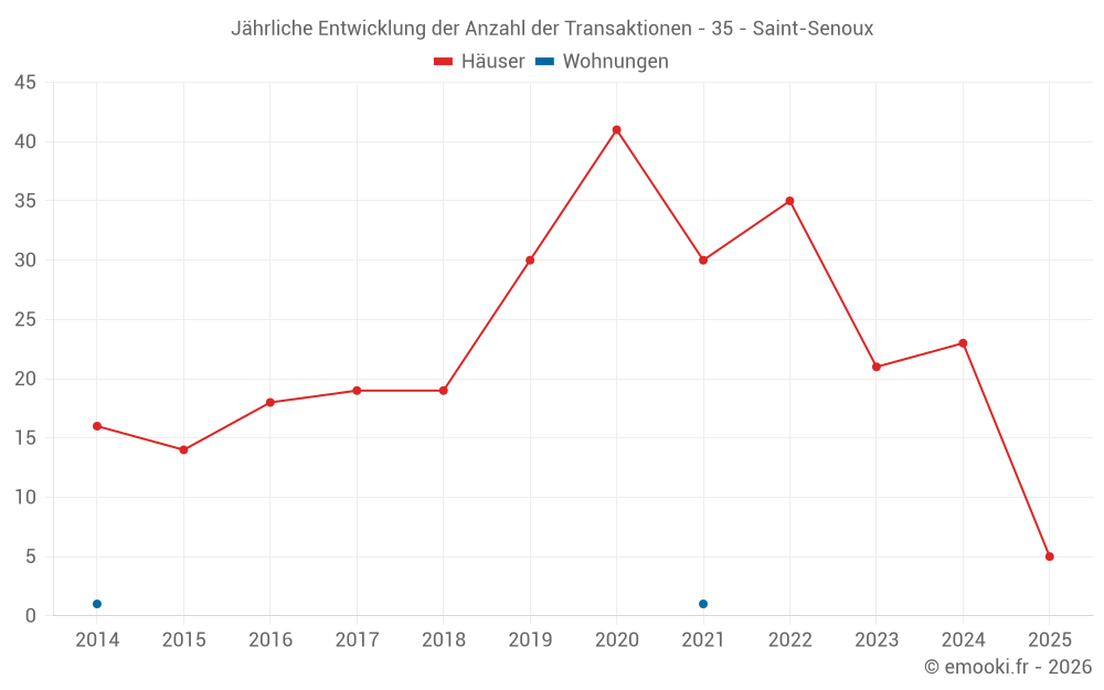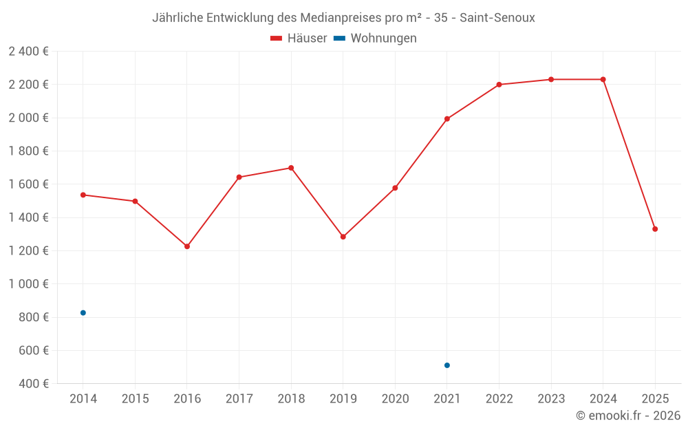Der Durchschnittspreis auf den 21 Hausgeschäften der letzten 12 Monate in der Gemeinde Saint-Senoux betrug 2 196 € pro Quadratmeter für einen mittleren Immobilienwert von 190 000 €. Über diesen Zeitraum hinweg lagen 60% der Transaktionen zwischen 1 081 und 2 534 € pro Quadratmeter (vom 2. bis zum 8. Dezil).