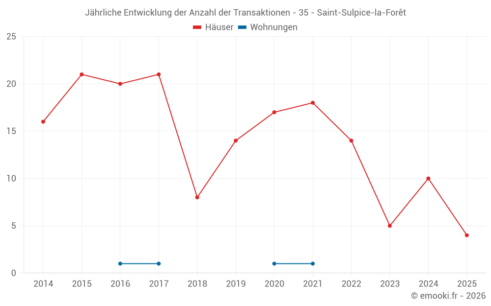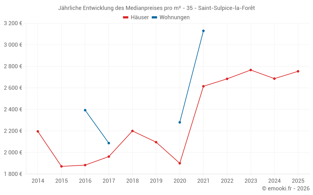 Der Durchschnittspreis auf den 14 Hausgeschäften der letzten 24 Monate in der Gemeinde Saint-Sulpice-la-Forêt betrug 2 708 € pro Quadratmeter für einen mittleren Immobilienwert von 299 500 €. Über diesen Zeitraum hinweg lagen 60% der Transaktionen zwischen 2 068 und 3 105 € pro Quadratmeter (vom 2. bis zum 8. Dezil).