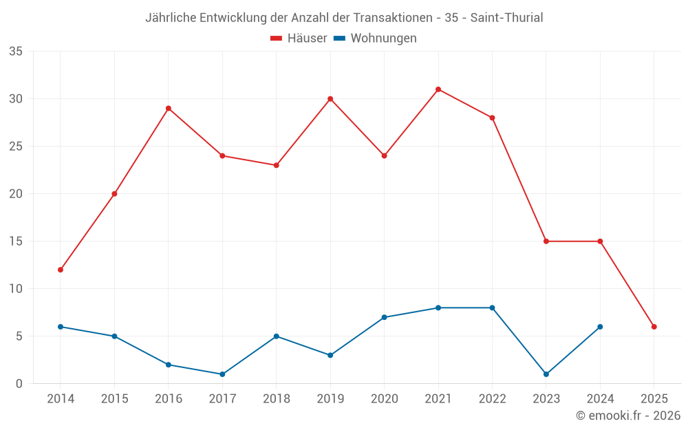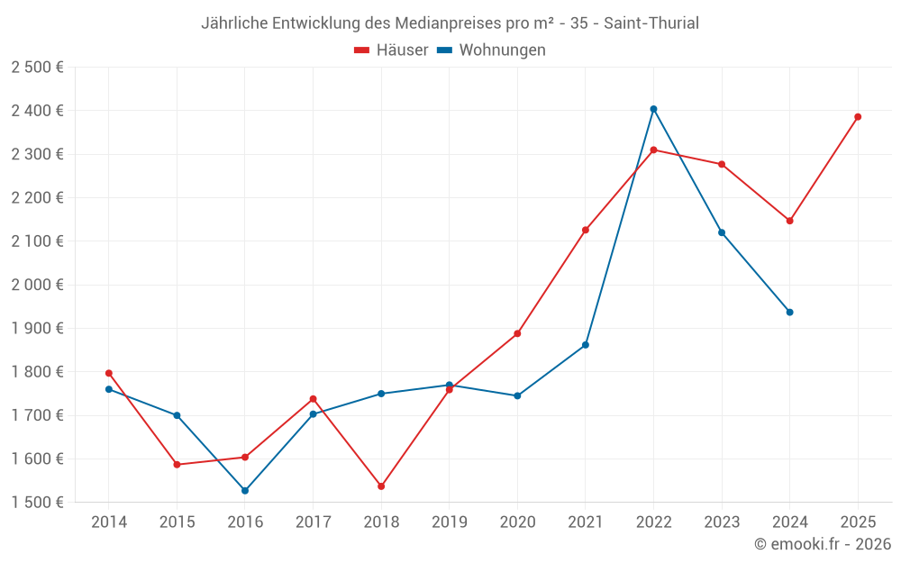 Der Durchschnittspreis auf den 17 Hausgeschäften der letzten 12 Monate in der Gemeinde Saint-Thurial betrug 2 184 € pro Quadratmeter für einen mittleren Immobilienwert von 256 000 €. Über diesen Zeitraum hinweg lagen 60% der Transaktionen zwischen 1 977 und 2 409 € pro Quadratmeter (vom 2. bis zum 8. Dezil).