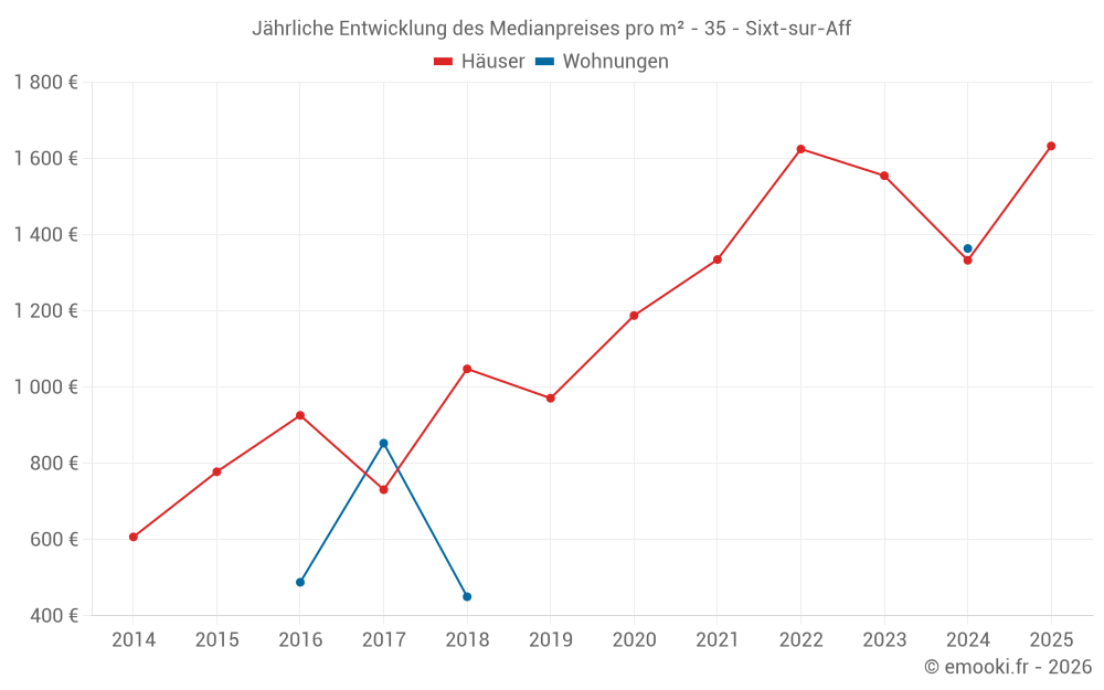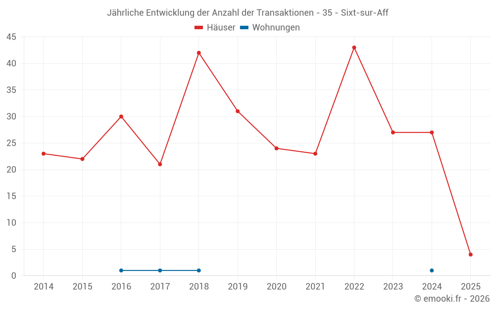 Der Durchschnittspreis auf den 17 Hausgeschäften der letzten 12 Monate in der Gemeinde Sixt-sur-Aff betrug 1 463 € pro Quadratmeter für einen mittleren Immobilienwert von 153 050 €. Über diesen Zeitraum hinweg lagen 60% der Transaktionen zwischen 1 056 und 2 065 € pro Quadratmeter (vom 2. bis zum 8. Dezil).