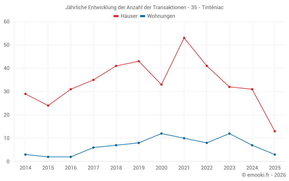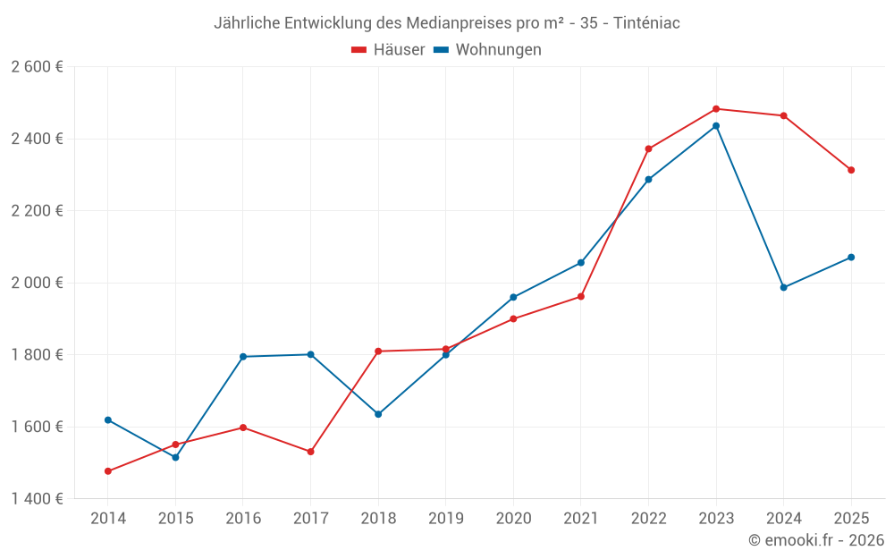 Der Durchschnittspreis auf den 31 Hausgeschäften der letzten 12 Monate in der Gemeinde Tinténiac betrug 2 320 € pro Quadratmeter für einen mittleren Immobilienwert von 230 000 €. Über diesen Zeitraum hinweg lagen 60% der Transaktionen zwischen 1 856 und 2 706 € pro Quadratmeter (vom 2. bis zum 8. Dezil).