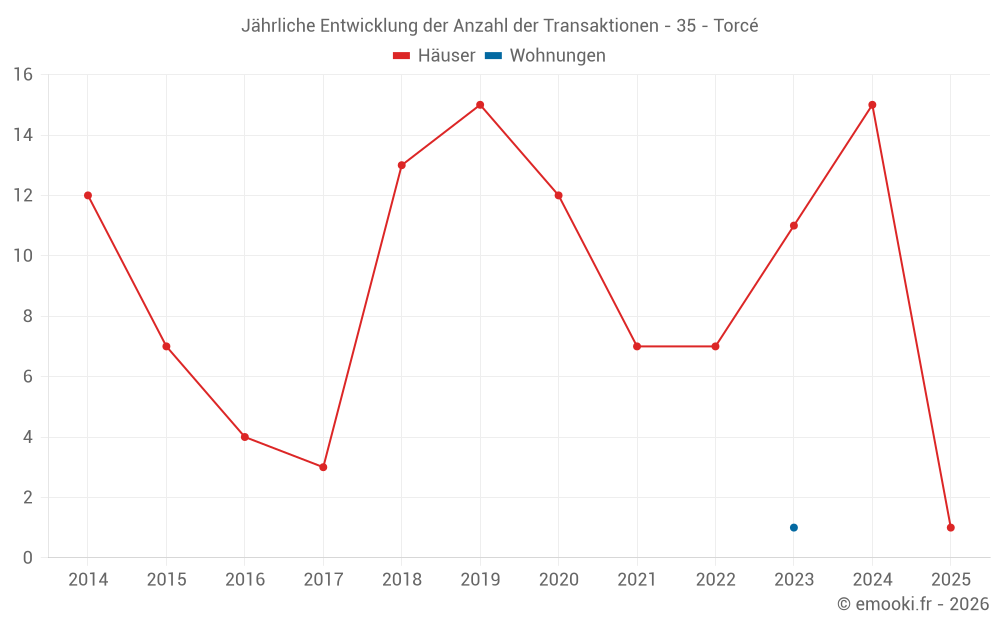 Der Durchschnittspreis auf den 17 Hausgeschäften der letzten 24 Monate in der Gemeinde Torcé betrug 1 765 € pro Quadratmeter für einen mittleren Immobilienwert von 190 000 €. Über diesen Zeitraum hinweg lagen 60% der Transaktionen zwischen 1 669 und 2 319 € pro Quadratmeter (vom 2. bis zum 8. Dezil).