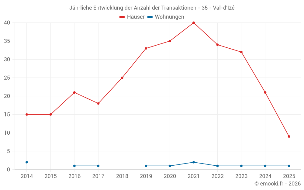 Der Durchschnittspreis auf den 20 Hausgeschäften der letzten 12 Monate in der Gemeinde Val-d'Izé betrug 1 788 € pro Quadratmeter für einen mittleren Immobilienwert von 202 500 €. Über diesen Zeitraum hinweg lagen 60% der Transaktionen zwischen 1 518 und 2 184 € pro Quadratmeter (vom 2. bis zum 8. Dezil).
