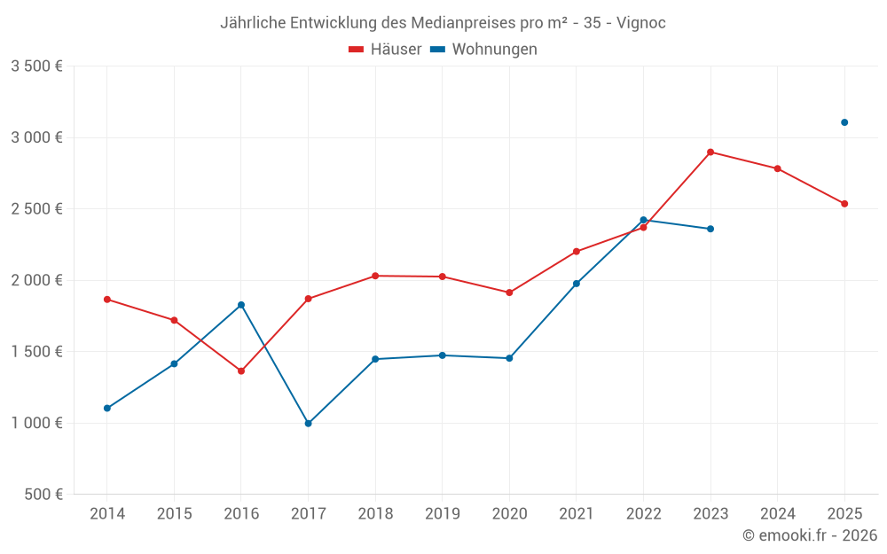 Der Durchschnittspreis auf den 24 Hausgeschäften der letzten 12 Monate in der Gemeinde Vignoc betrug 2 686 € pro Quadratmeter für einen mittleren Immobilienwert von 292 750 €. Über diesen Zeitraum hinweg lagen 60% der Transaktionen zwischen 2 052 und 3 007 € pro Quadratmeter (vom 2. bis zum 8. Dezil).