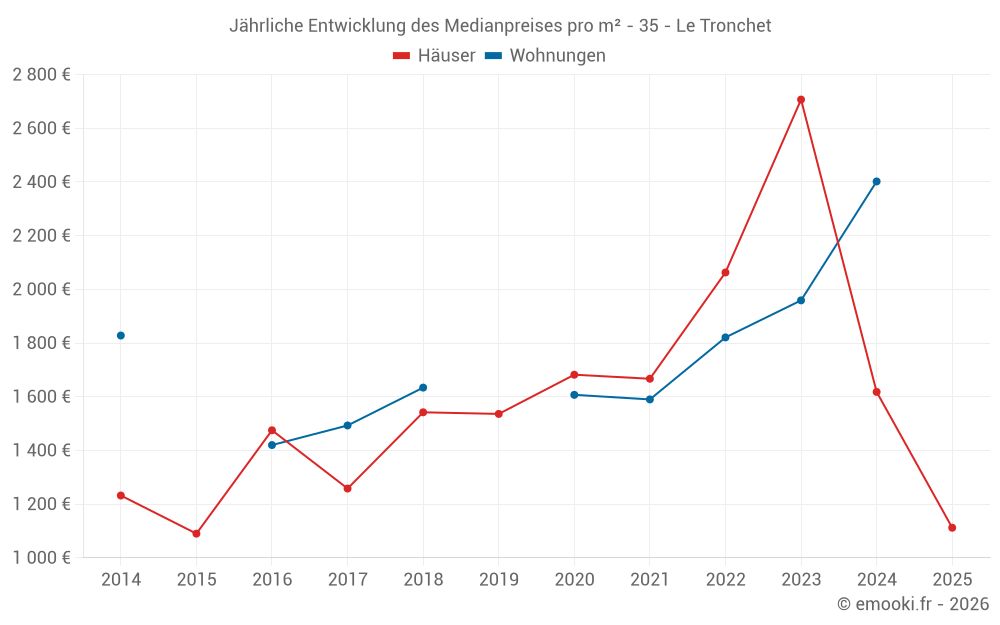 Der Durchschnittspreis auf den 26 Hausgeschäften der letzten 24 Monate in der Gemeinde Le Tronchet betrug 2 090 € pro Quadratmeter für einen mittleren Immobilienwert von 173 500 €. Über diesen Zeitraum hinweg lagen 60% der Transaktionen zwischen 1 250 und 2 707 € pro Quadratmeter (vom 2. bis zum 8. Dezil).