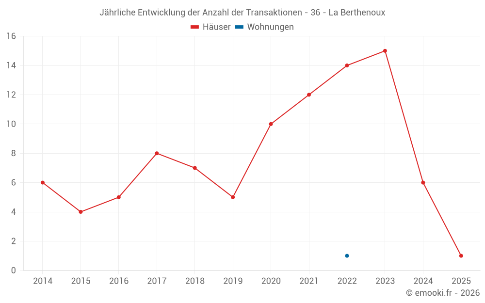 Der Durchschnittspreis auf den 18 Hausgeschäften der letzten 24 Monate in der Gemeinde La Berthenoux betrug 776 € pro Quadratmeter für einen mittleren Immobilienwert von 91 000 €. Über diesen Zeitraum hinweg lagen 60% der Transaktionen zwischen 614 und 1 154 € pro Quadratmeter (vom 2. bis zum 8. Dezil).
