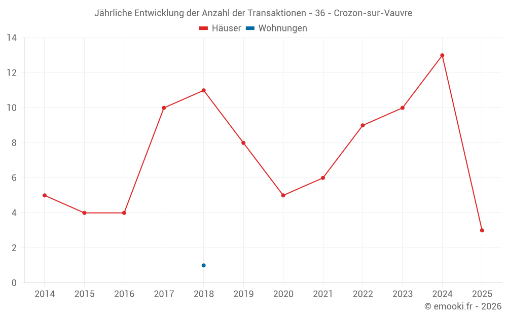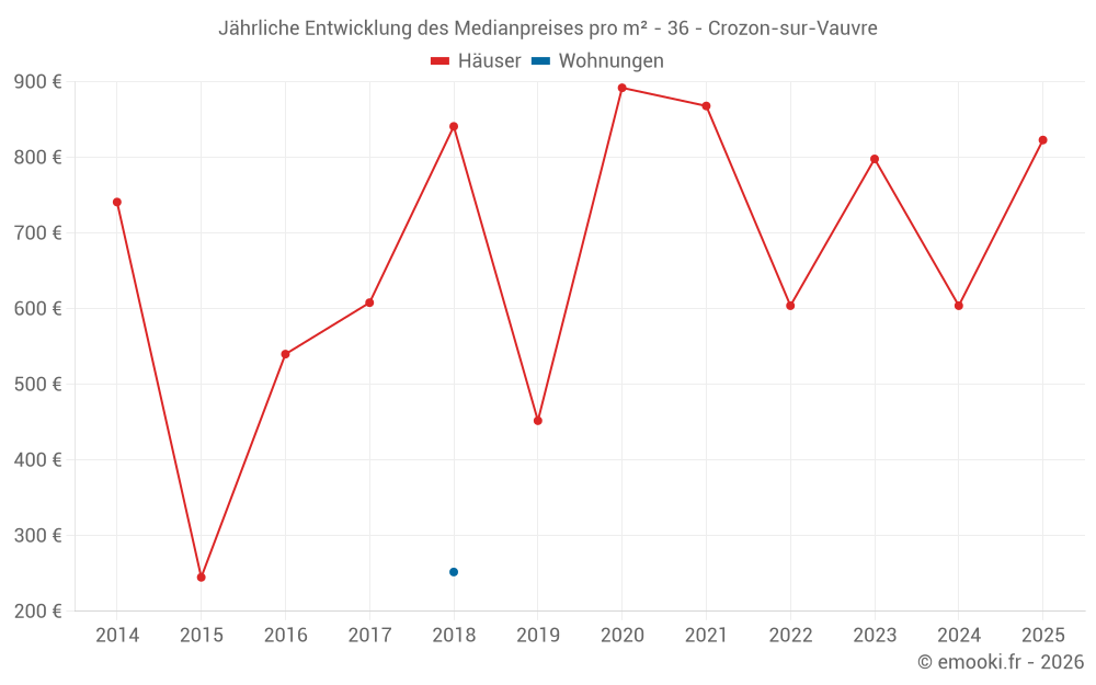 Der Durchschnittspreis auf den 24 Hausgeschäften der letzten 24 Monate in der Gemeinde Crozon-sur-Vauvre betrug 703 € pro Quadratmeter für einen mittleren Immobilienwert von 56 250 €. Über diesen Zeitraum hinweg lagen 60% der Transaktionen zwischen 263 und 1 376 € pro Quadratmeter (vom 2. bis zum 8. Dezil).