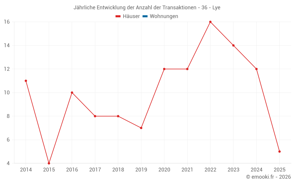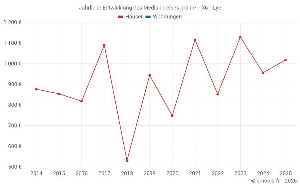 Der Durchschnittspreis auf den 29 Hausgeschäften der letzten 24 Monate in der Gemeinde Lye betrug 1 066 € pro Quadratmeter für einen mittleren Immobilienwert von 100 000 €. Über diesen Zeitraum hinweg lagen 60% der Transaktionen zwischen 755 und 1 494 € pro Quadratmeter (vom 2. bis zum 8. Dezil).