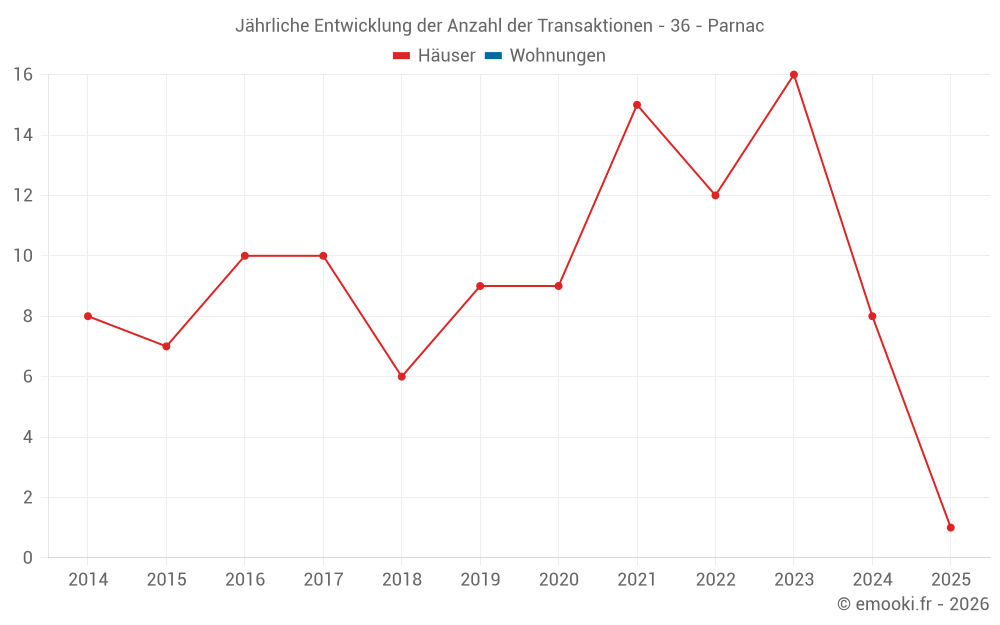 Der Durchschnittspreis auf den 17 Hausgeschäften der letzten 24 Monate in der Gemeinde Parnac betrug 1 000 € pro Quadratmeter für einen mittleren Immobilienwert von 63 000 €. Über diesen Zeitraum hinweg lagen 60% der Transaktionen zwischen 574 und 1 529 € pro Quadratmeter (vom 2. bis zum 8. Dezil).