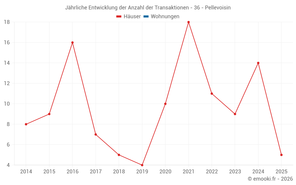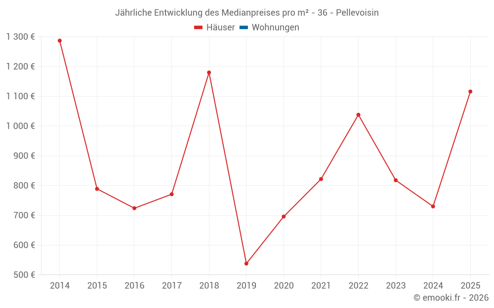Der Durchschnittspreis auf den 23 Hausgeschäften der letzten 24 Monate in der Gemeinde Pellevoisin betrug 833 € pro Quadratmeter für einen mittleren Immobilienwert von 62 500 €. Über diesen Zeitraum hinweg lagen 60% der Transaktionen zwischen 464 und 1 216 € pro Quadratmeter (vom 2. bis zum 8. Dezil).