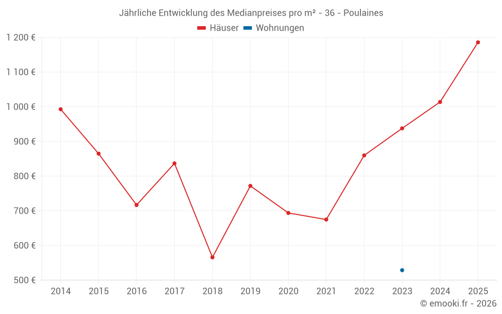 Der Durchschnittspreis auf den 26 Hausgeschäften der letzten 24 Monate in der Gemeinde Poulaines betrug 982 € pro Quadratmeter für einen mittleren Immobilienwert von 68 500 €. Über diesen Zeitraum hinweg lagen 60% der Transaktionen zwischen 714 und 1 240 € pro Quadratmeter (vom 2. bis zum 8. Dezil).