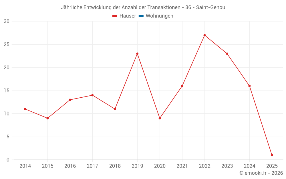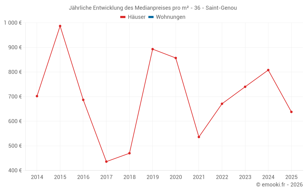 Der Durchschnittspreis auf den 26 Hausgeschäften der letzten 24 Monate in der Gemeinde Saint-Genou betrug 793 € pro Quadratmeter für einen mittleren Immobilienwert von 69 500 €. Über diesen Zeitraum hinweg lagen 60% der Transaktionen zwischen 584 und 1 133 € pro Quadratmeter (vom 2. bis zum 8. Dezil).
