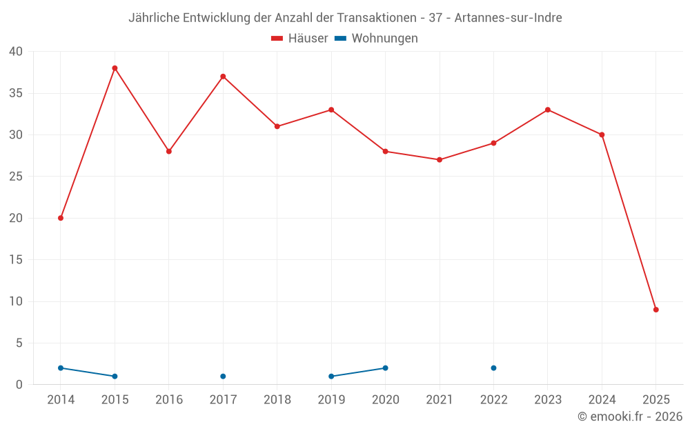 Der Durchschnittspreis auf den 24 Hausgeschäften der letzten 12 Monate in der Gemeinde Artannes-sur-Indre betrug 2 384 € pro Quadratmeter für einen mittleren Immobilienwert von 215 150 €. Über diesen Zeitraum hinweg lagen 60% der Transaktionen zwischen 1 754 und 2 625 € pro Quadratmeter (vom 2. bis zum 8. Dezil).