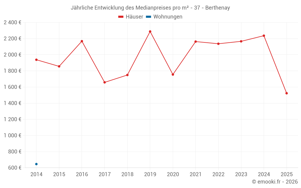 Der Durchschnittspreis auf den 15 Hausgeschäften der letzten 24 Monate in der Gemeinde Berthenay betrug 2 236 € pro Quadratmeter für einen mittleren Immobilienwert von 237 000 €. Über diesen Zeitraum hinweg lagen 60% der Transaktionen zwischen 1 406 und 2 523 € pro Quadratmeter (vom 2. bis zum 8. Dezil).