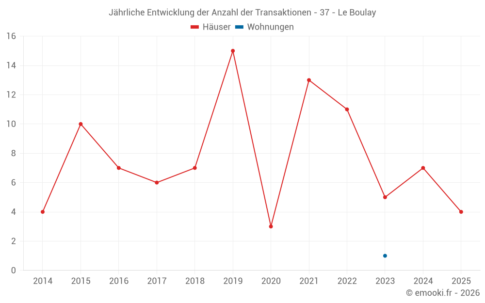 Der Durchschnittspreis auf den 14 Hausgeschäften der letzten 24 Monate in der Gemeinde Le Boulay betrug 1 583 € pro Quadratmeter für einen mittleren Immobilienwert von 208 000 €. Über diesen Zeitraum hinweg lagen 60% der Transaktionen zwischen 1 281 und 2 106 € pro Quadratmeter (vom 2. bis zum 8. Dezil).