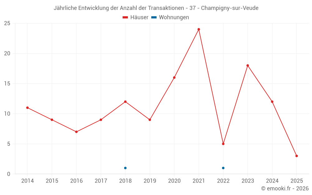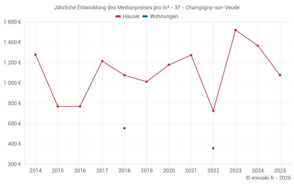 Der Durchschnittspreis auf den 24 Hausgeschäften der letzten 24 Monate in der Gemeinde Champigny-sur-Veude betrug 1 317 € pro Quadratmeter für einen mittleren Immobilienwert von 110 500 €. Über diesen Zeitraum hinweg lagen 60% der Transaktionen zwischen 997 und 1 794 € pro Quadratmeter (vom 2. bis zum 8. Dezil).