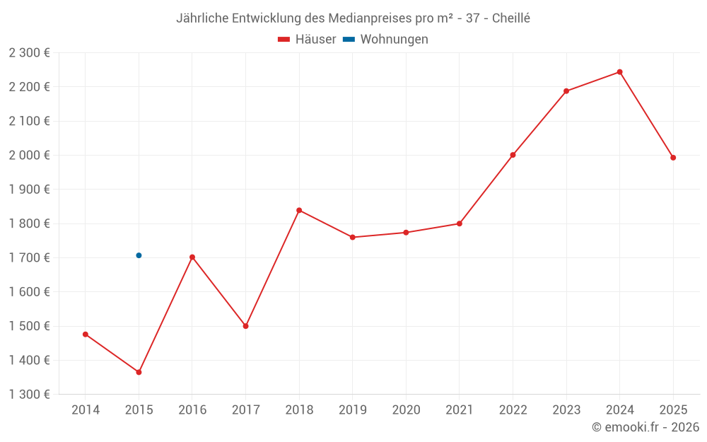 Der Durchschnittspreis auf den 18 Hausgeschäften der letzten 12 Monate in der Gemeinde Cheillé betrug 2 021 € pro Quadratmeter für einen mittleren Immobilienwert von 166 500 €. Über diesen Zeitraum hinweg lagen 60% der Transaktionen zwischen 1 471 und 2 587 € pro Quadratmeter (vom 2. bis zum 8. Dezil).