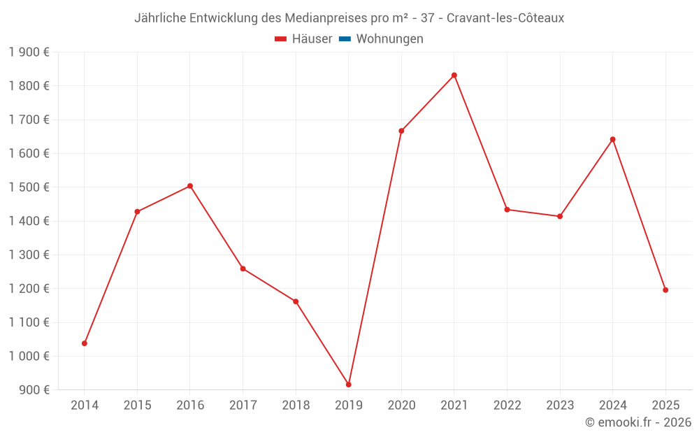 Der Durchschnittspreis auf den 15 Hausgeschäften der letzten 24 Monate in der Gemeinde Cravant-les-Côteaux betrug 1 446 € pro Quadratmeter für einen mittleren Immobilienwert von 145 200 €. Über diesen Zeitraum hinweg lagen 60% der Transaktionen zwischen 877 und 1 832 € pro Quadratmeter (vom 2. bis zum 8. Dezil).