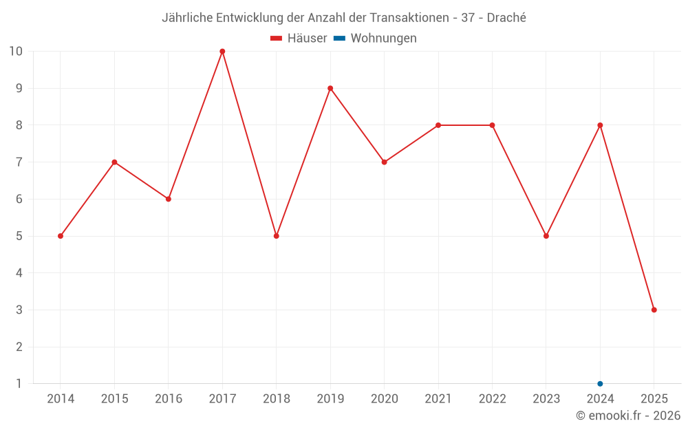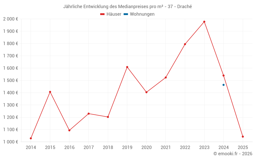 Der Durchschnittspreis auf den 14 Hausgeschäften der letzten 24 Monate in der Gemeinde Draché betrug 1 586 € pro Quadratmeter für einen mittleren Immobilienwert von 143 100 €. Über diesen Zeitraum hinweg lagen 60% der Transaktionen zwischen 1 134 und 1 913 € pro Quadratmeter (vom 2. bis zum 8. Dezil).