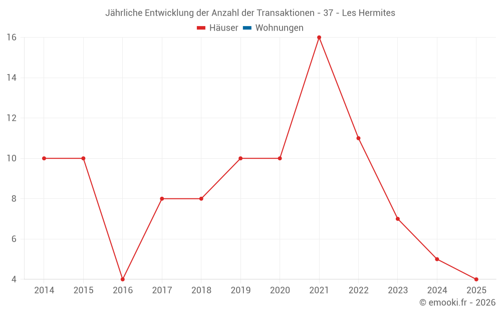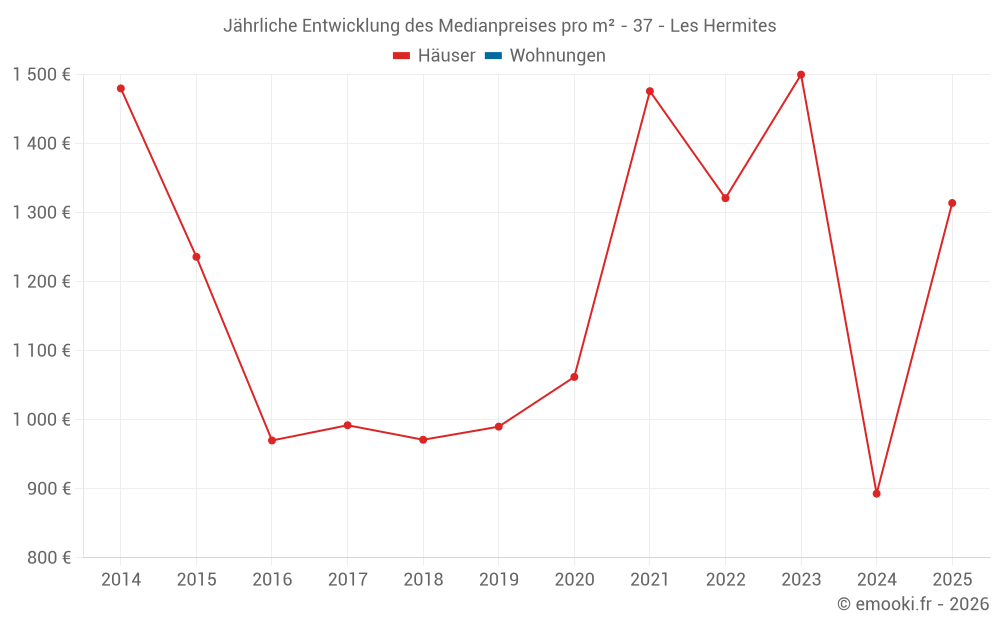 Der Durchschnittspreis auf den 14 Hausgeschäften der letzten 24 Monate in der Gemeinde Les Hermites betrug 1 358 € pro Quadratmeter für einen mittleren Immobilienwert von 141 000 €. Über diesen Zeitraum hinweg lagen 60% der Transaktionen zwischen 886 und 1 682 € pro Quadratmeter (vom 2. bis zum 8. Dezil).