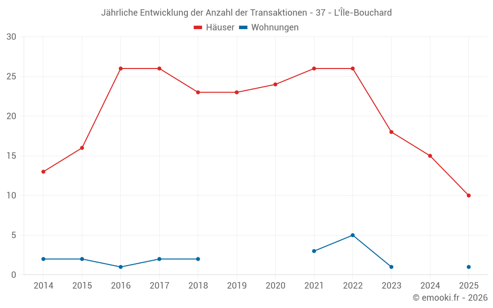 Der Durchschnittspreis auf den 19 Hausgeschäften der letzten 12 Monate in der Gemeinde L'Île-Bouchard betrug 1 246 € pro Quadratmeter für einen mittleren Immobilienwert von 132 100 €. Über diesen Zeitraum hinweg lagen 60% der Transaktionen zwischen 960 und 1 538 € pro Quadratmeter (vom 2. bis zum 8. Dezil).