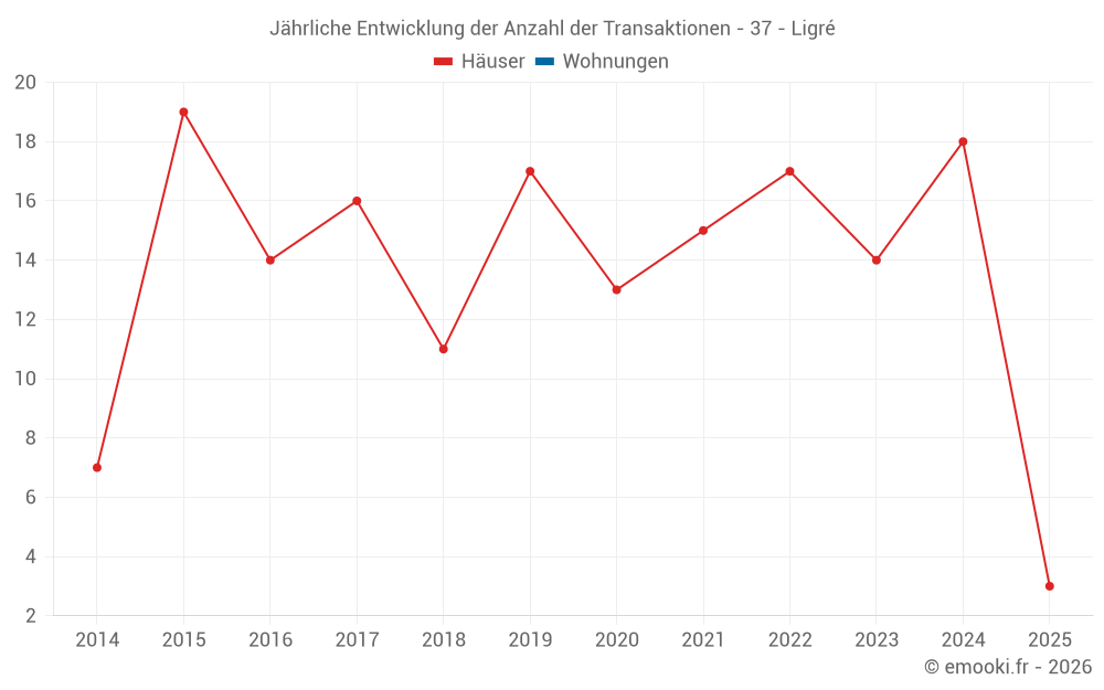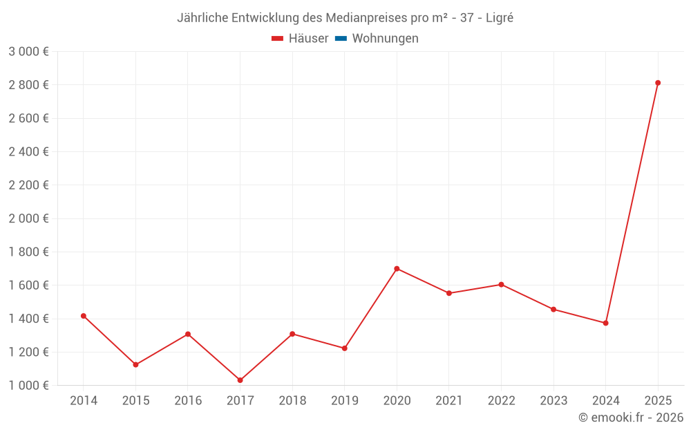 Der Durchschnittspreis auf den 27 Hausgeschäften der letzten 24 Monate in der Gemeinde Ligré betrug 1 394 € pro Quadratmeter für einen mittleren Immobilienwert von 153 000 €. Über diesen Zeitraum hinweg lagen 60% der Transaktionen zwischen 998 und 1 978 € pro Quadratmeter (vom 2. bis zum 8. Dezil).