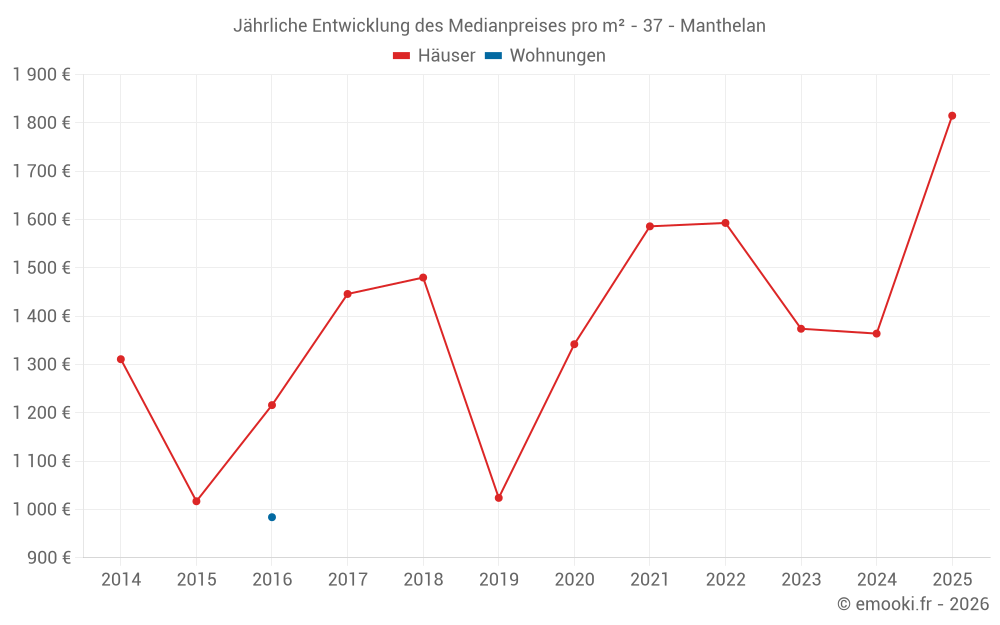 Der Durchschnittspreis auf den 18 Hausgeschäften der letzten 12 Monate in der Gemeinde Manthelan betrug 1 582 € pro Quadratmeter für einen mittleren Immobilienwert von 163 000 €. Über diesen Zeitraum hinweg lagen 60% der Transaktionen zwischen 1 184 und 2 023 € pro Quadratmeter (vom 2. bis zum 8. Dezil).