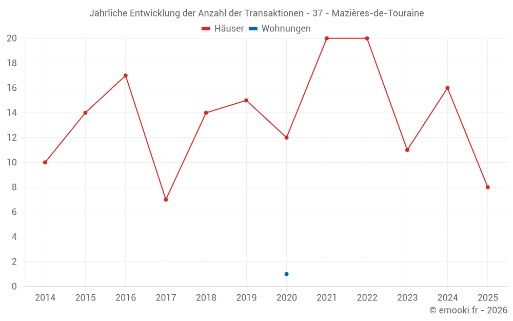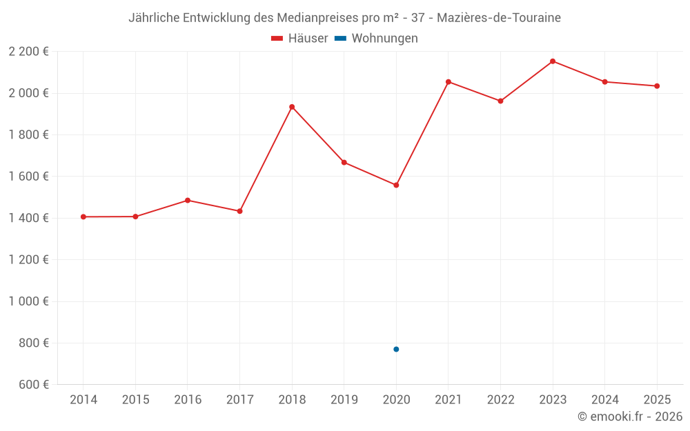 Der Durchschnittspreis auf den 20 Hausgeschäften der letzten 12 Monate in der Gemeinde Mazières-de-Touraine betrug 2 014 € pro Quadratmeter für einen mittleren Immobilienwert von 218 000 €. Über diesen Zeitraum hinweg lagen 60% der Transaktionen zwischen 1 637 und 2 300 € pro Quadratmeter (vom 2. bis zum 8. Dezil).