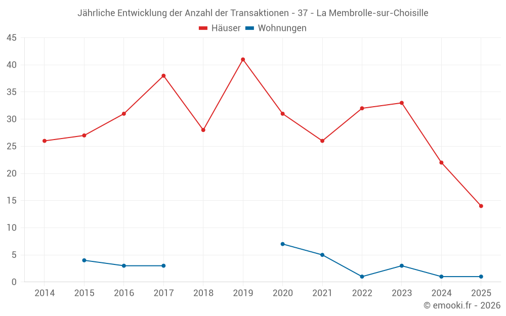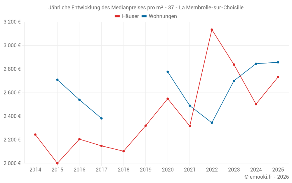 Der Durchschnittspreis auf den 26 Hausgeschäften der letzten 12 Monate in der Gemeinde La Membrolle-sur-Choisille betrug 2 596 € pro Quadratmeter für einen mittleren Immobilienwert von 227 100 €. Über diesen Zeitraum hinweg lagen 60% der Transaktionen zwischen 1 452 und 2 850 € pro Quadratmeter (vom 2. bis zum 8. Dezil).