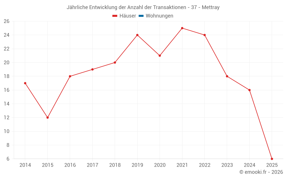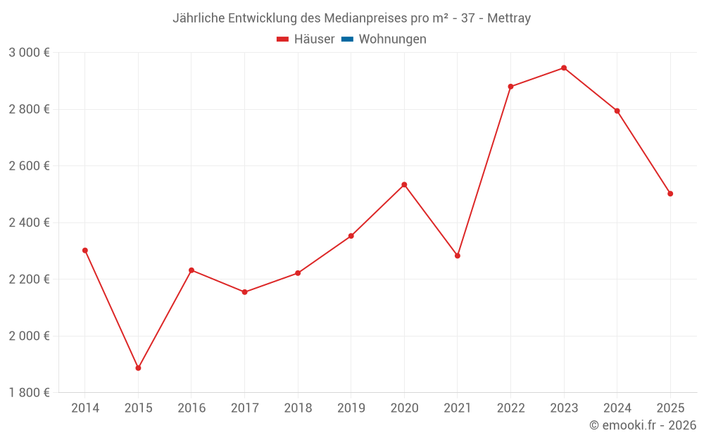 Der Durchschnittspreis auf den 32 Hausgeschäften der letzten 24 Monate in der Gemeinde Mettray betrug 2 606 € pro Quadratmeter für einen mittleren Immobilienwert von 317 500 €. Über diesen Zeitraum hinweg lagen 60% der Transaktionen zwischen 2 135 und 3 239 € pro Quadratmeter (vom 2. bis zum 8. Dezil).