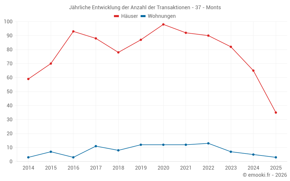 Der Durchschnittspreis auf den 35 Hausgeschäften der letzten 6 Monate in der Gemeinde Monts betrug 2 450 € pro Quadratmeter für einen mittleren Immobilienwert von 230 000 €. Über diesen Zeitraum hinweg lagen 60% der Transaktionen zwischen 1 917 und 3 096 € pro Quadratmeter (vom 2. bis zum 8. Dezil).