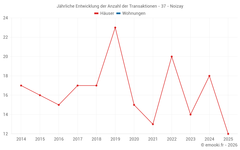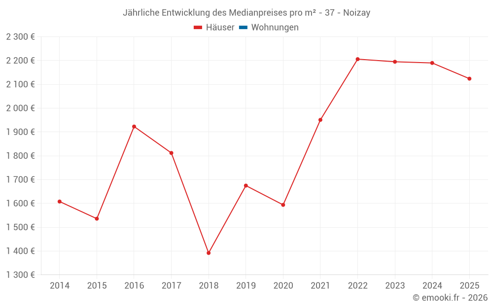 Der Durchschnittspreis auf den 25 Hausgeschäften der letzten 12 Monate in der Gemeinde Noizay betrug 2 047 € pro Quadratmeter für einen mittleren Immobilienwert von 176 000 €. Über diesen Zeitraum hinweg lagen 60% der Transaktionen zwischen 1 120 und 3 173 € pro Quadratmeter (vom 2. bis zum 8. Dezil).