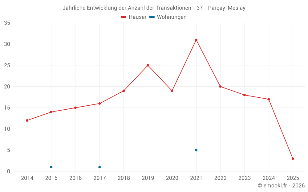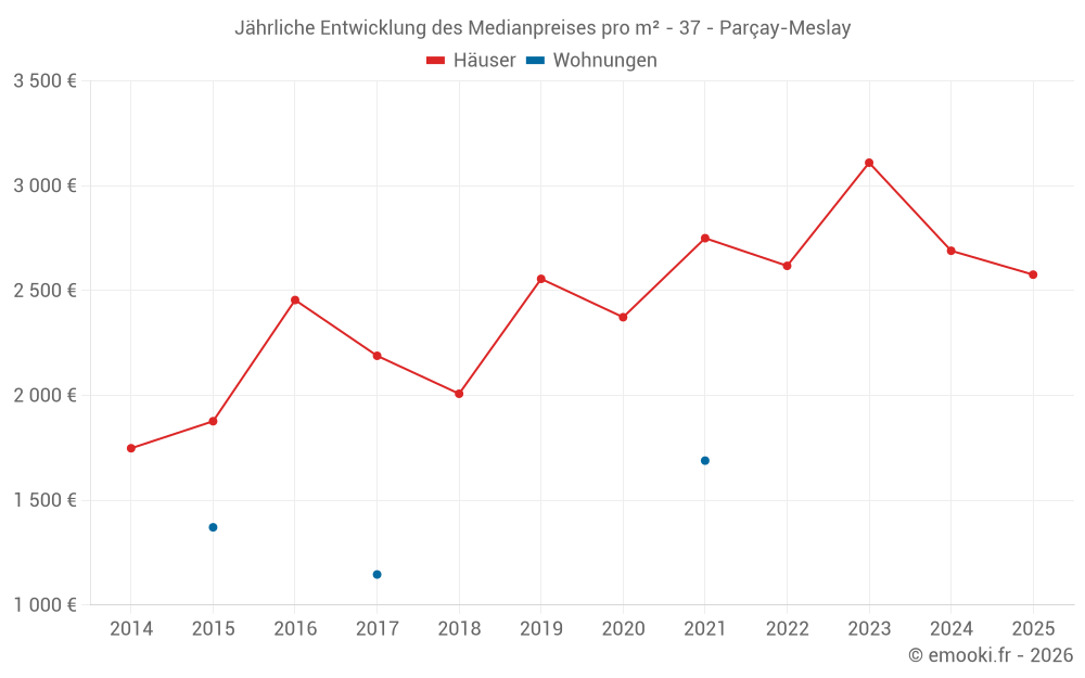 Der Durchschnittspreis auf den 16 Hausgeschäften der letzten 12 Monate in der Gemeinde Parçay-Meslay betrug 2 633 € pro Quadratmeter für einen mittleren Immobilienwert von 245 250 €. Über diesen Zeitraum hinweg lagen 60% der Transaktionen zwischen 1 975 und 3 338 € pro Quadratmeter (vom 2. bis zum 8. Dezil).