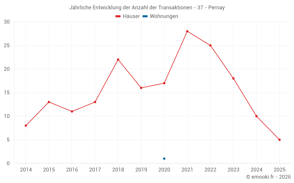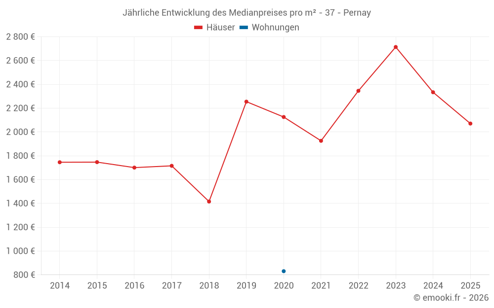 Der Durchschnittspreis auf den 24 Hausgeschäften der letzten 24 Monate in der Gemeinde Pernay betrug 2 284 € pro Quadratmeter für einen mittleren Immobilienwert von 242 500 €. Über diesen Zeitraum hinweg lagen 60% der Transaktionen zwischen 1 972 und 2 977 € pro Quadratmeter (vom 2. bis zum 8. Dezil).