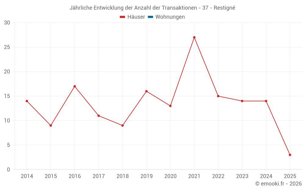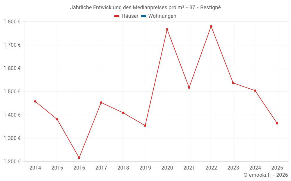 Der Durchschnittspreis auf den 25 Hausgeschäften der letzten 24 Monate in der Gemeinde Restigné betrug 1 533 € pro Quadratmeter für einen mittleren Immobilienwert von 210 000 €. Über diesen Zeitraum hinweg lagen 60% der Transaktionen zwischen 1 326 und 2 383 € pro Quadratmeter (vom 2. bis zum 8. Dezil).