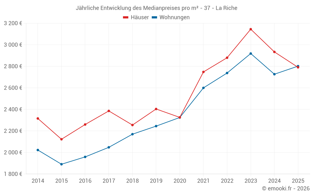 Der Durchschnittspreis auf den 19 Hausgeschäften der letzten 6 Monate in der Gemeinde La Riche betrug 2 791 € pro Quadratmeter für einen mittleren Immobilienwert von 230 500 €. Über diesen Zeitraum hinweg lagen 60% der Transaktionen zwischen 1 996 und 2 939 € pro Quadratmeter (vom 2. bis zum 8. Dezil).