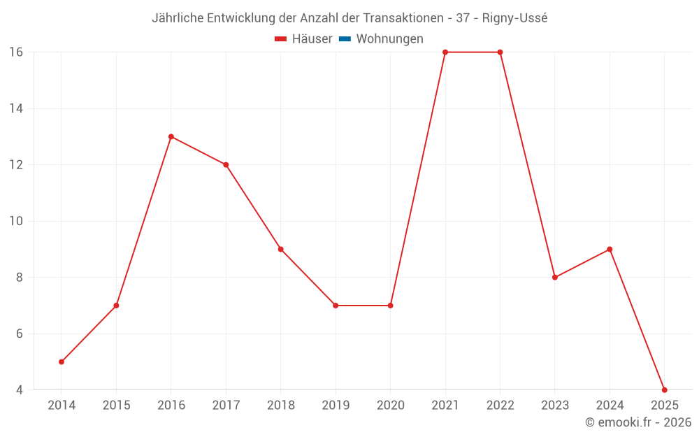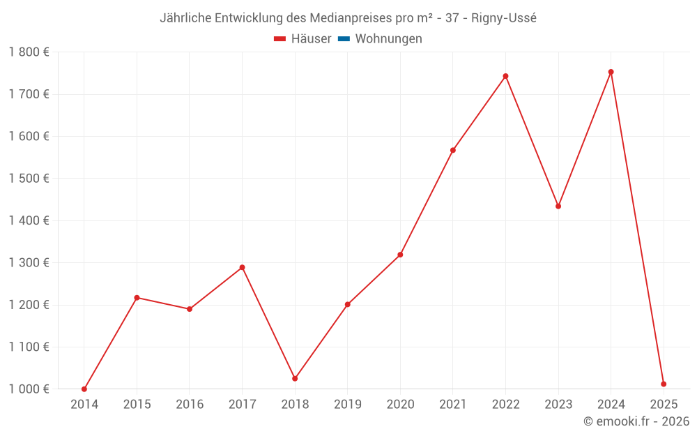 Der Durchschnittspreis auf den 16 Hausgeschäften der letzten 24 Monate in der Gemeinde Rigny-Ussé betrug 1 448 € pro Quadratmeter für einen mittleren Immobilienwert von 167 500 €. Über diesen Zeitraum hinweg lagen 60% der Transaktionen zwischen 989 und 2 037 € pro Quadratmeter (vom 2. bis zum 8. Dezil).