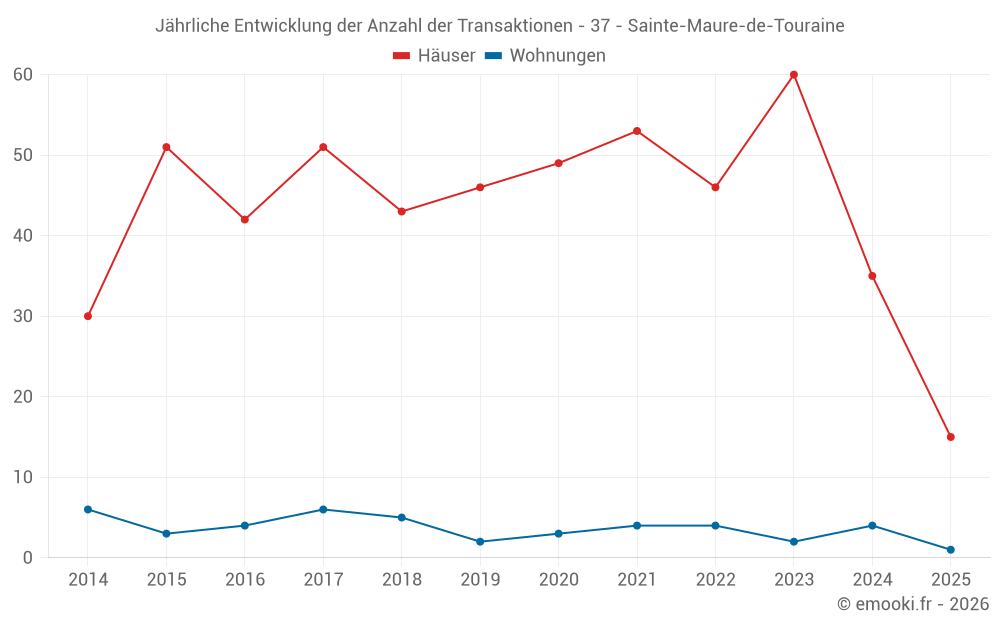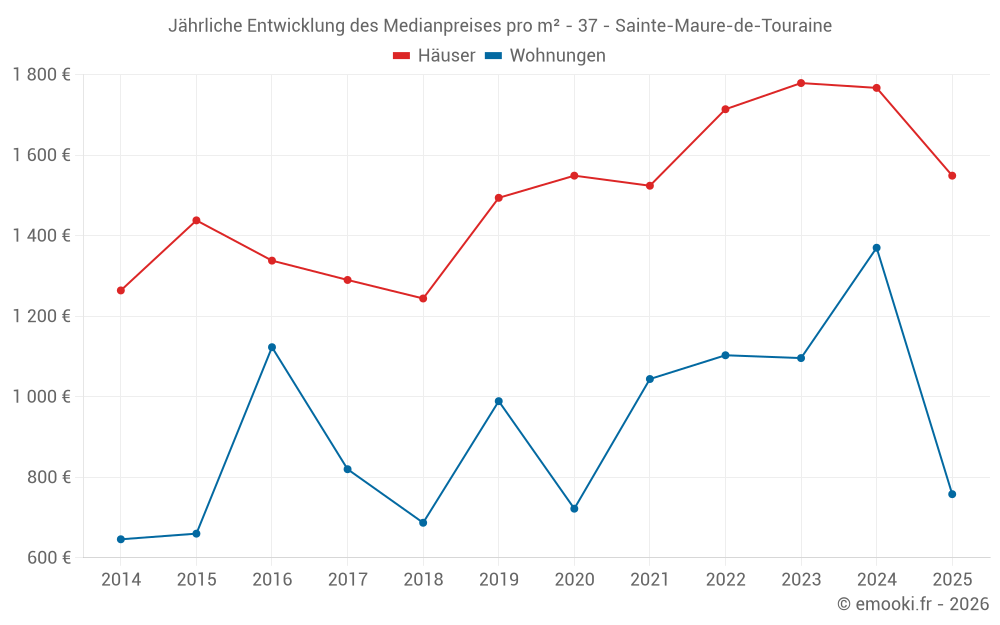 Der Durchschnittspreis auf den 31 Hausgeschäften der letzten 12 Monate in der Gemeinde Sainte-Maure-de-Touraine betrug 1 606 € pro Quadratmeter für einen mittleren Immobilienwert von 150 000 €. Über diesen Zeitraum hinweg lagen 60% der Transaktionen zwischen 1 471 und 2 215 € pro Quadratmeter (vom 2. bis zum 8. Dezil).
