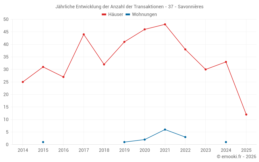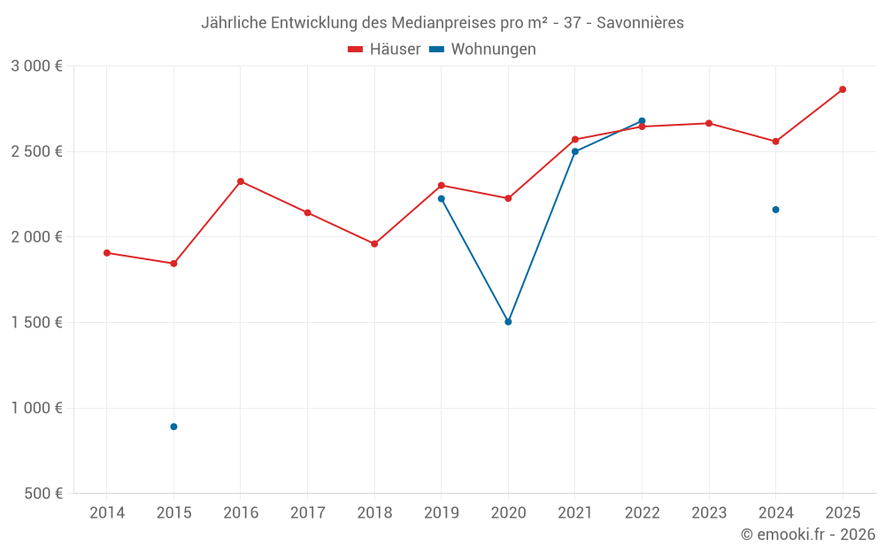 Der Durchschnittspreis auf den 30 Hausgeschäften der letzten 12 Monate in der Gemeinde Savonnières betrug 2 660 € pro Quadratmeter für einen mittleren Immobilienwert von 226 500 €. Über diesen Zeitraum hinweg lagen 60% der Transaktionen zwischen 1 234 und 3 198 € pro Quadratmeter (vom 2. bis zum 8. Dezil).