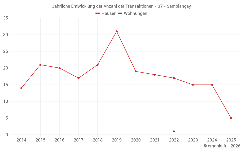 Der Durchschnittspreis auf den 28 Hausgeschäften der letzten 24 Monate in der Gemeinde Semblançay betrug 2 392 € pro Quadratmeter für einen mittleren Immobilienwert von 242 500 €. Über diesen Zeitraum hinweg lagen 60% der Transaktionen zwischen 1 851 und 2 789 € pro Quadratmeter (vom 2. bis zum 8. Dezil).